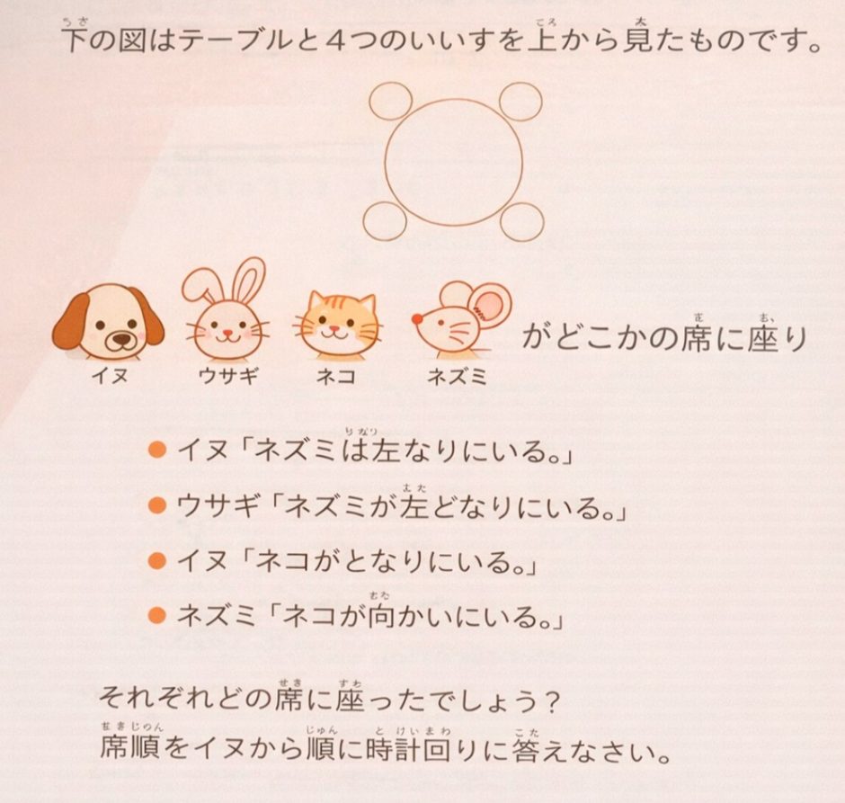 このパズルの最大の特徴は、「ルール(条件)を正しく読む」ことが正解への唯一の道である点です。 問題そのものはとても簡潔に出題されています。「左から2番目には赤が入る」「青の隣は赤ではない」といった条件を一つずつ整理するプロセスは、まさに国語の精読そのもの。算数のパズルを解いているはずが、いつの間にか文章を正確に読み取る訓練になっています。